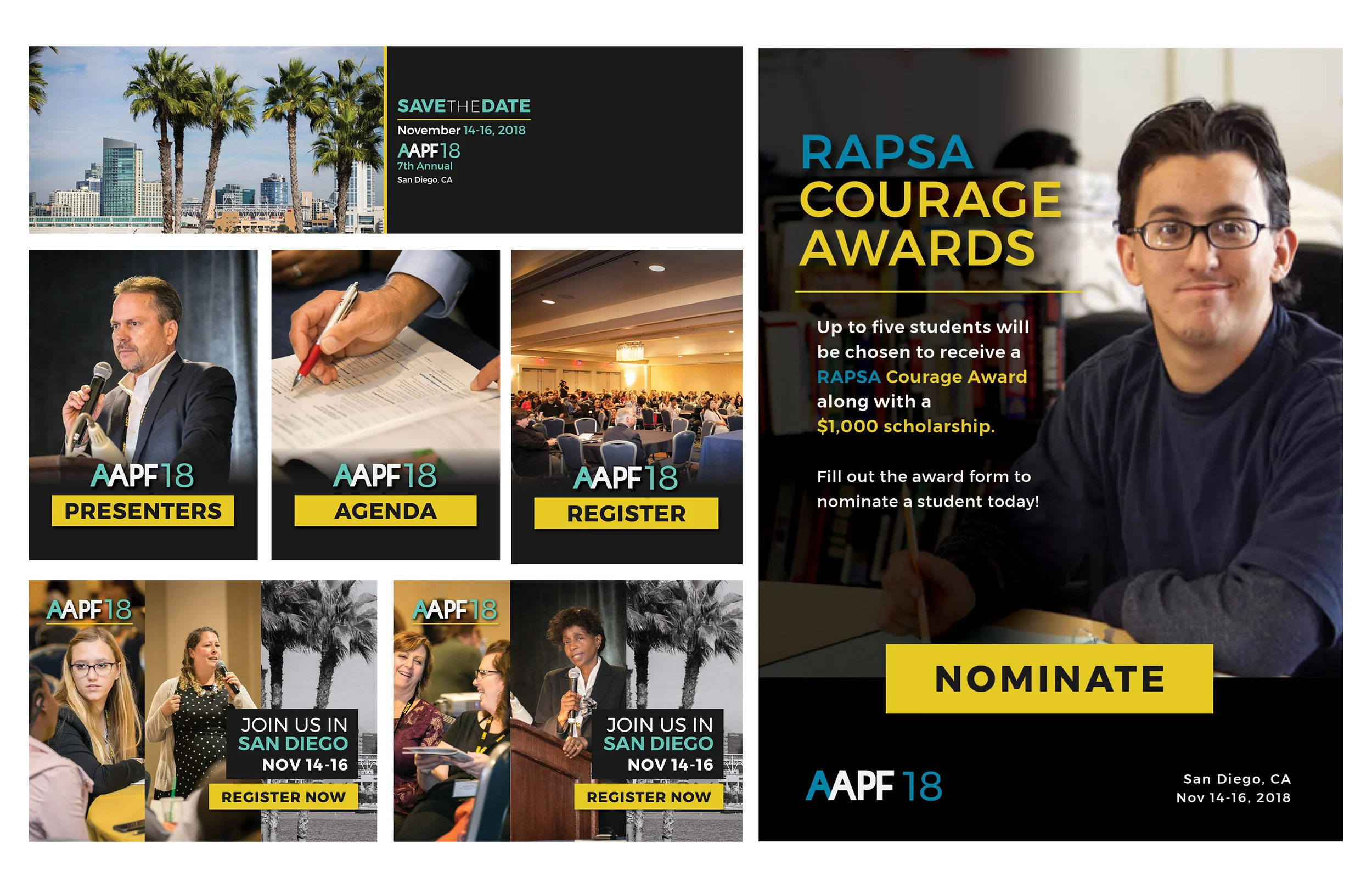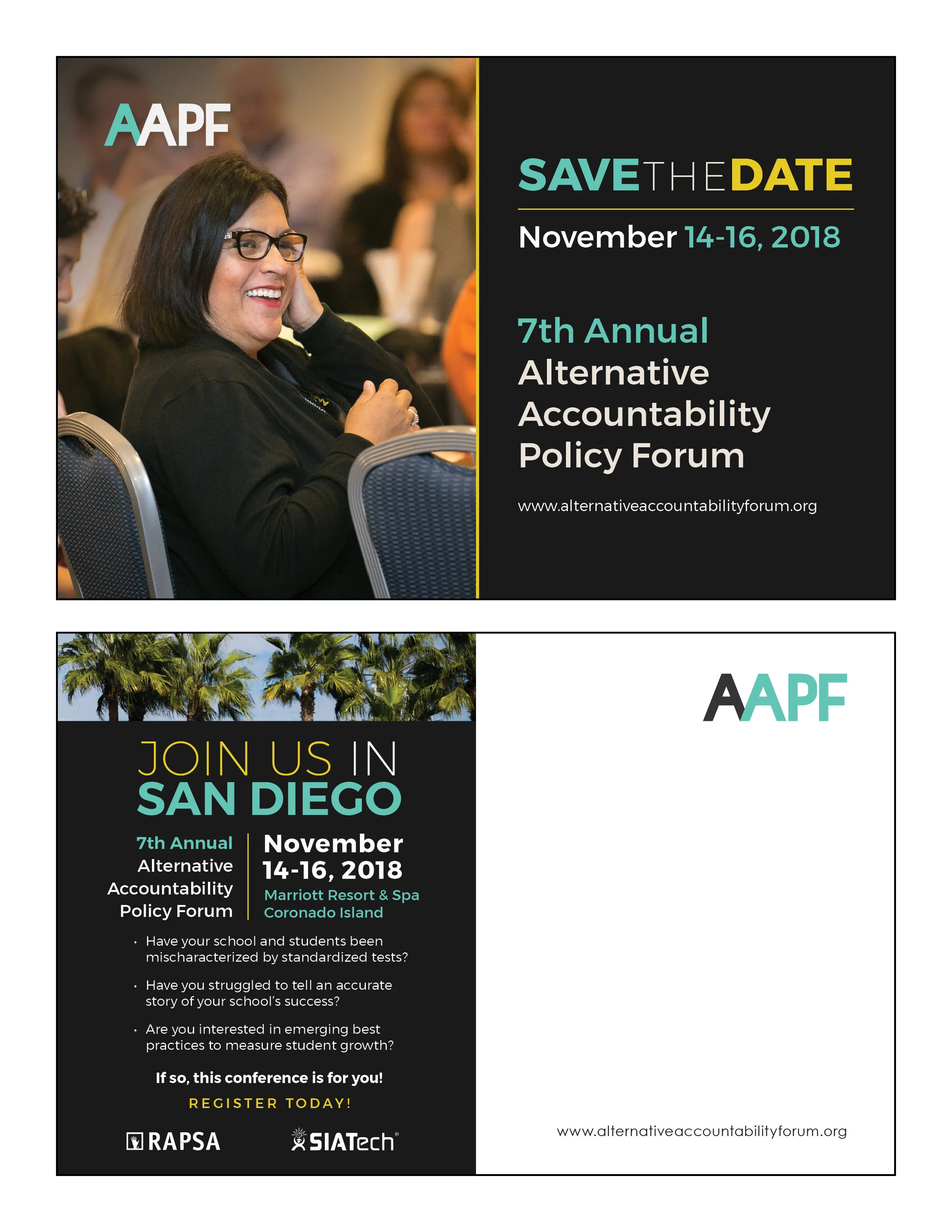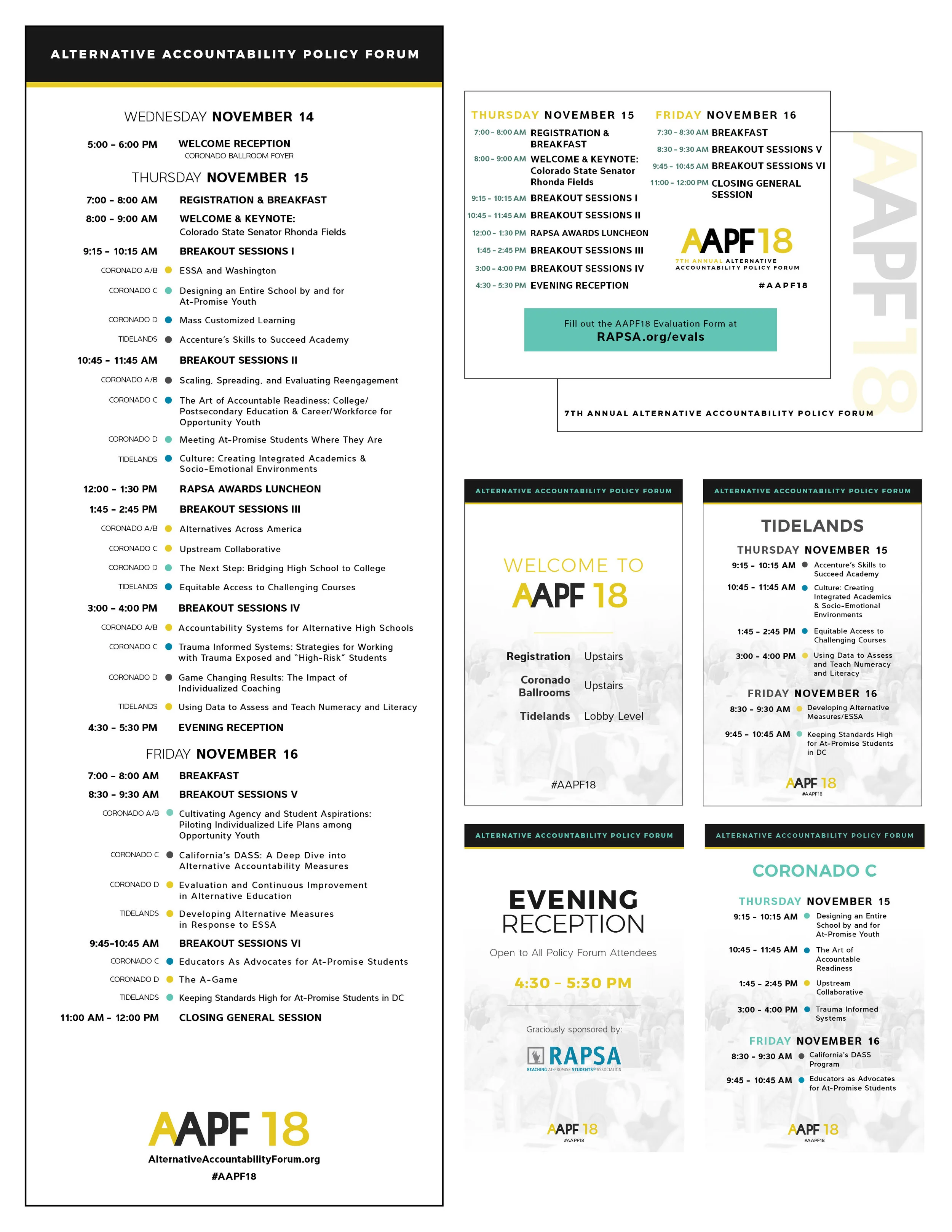 The Alternative Accountability Policy Forum is an annual education policy conference held in San Diego, CA. Both print and web materials were created with an updated brand from one previously established. Materials included web graphics, postcards, name badges, program booklets, easel boards, and stand-up banners.