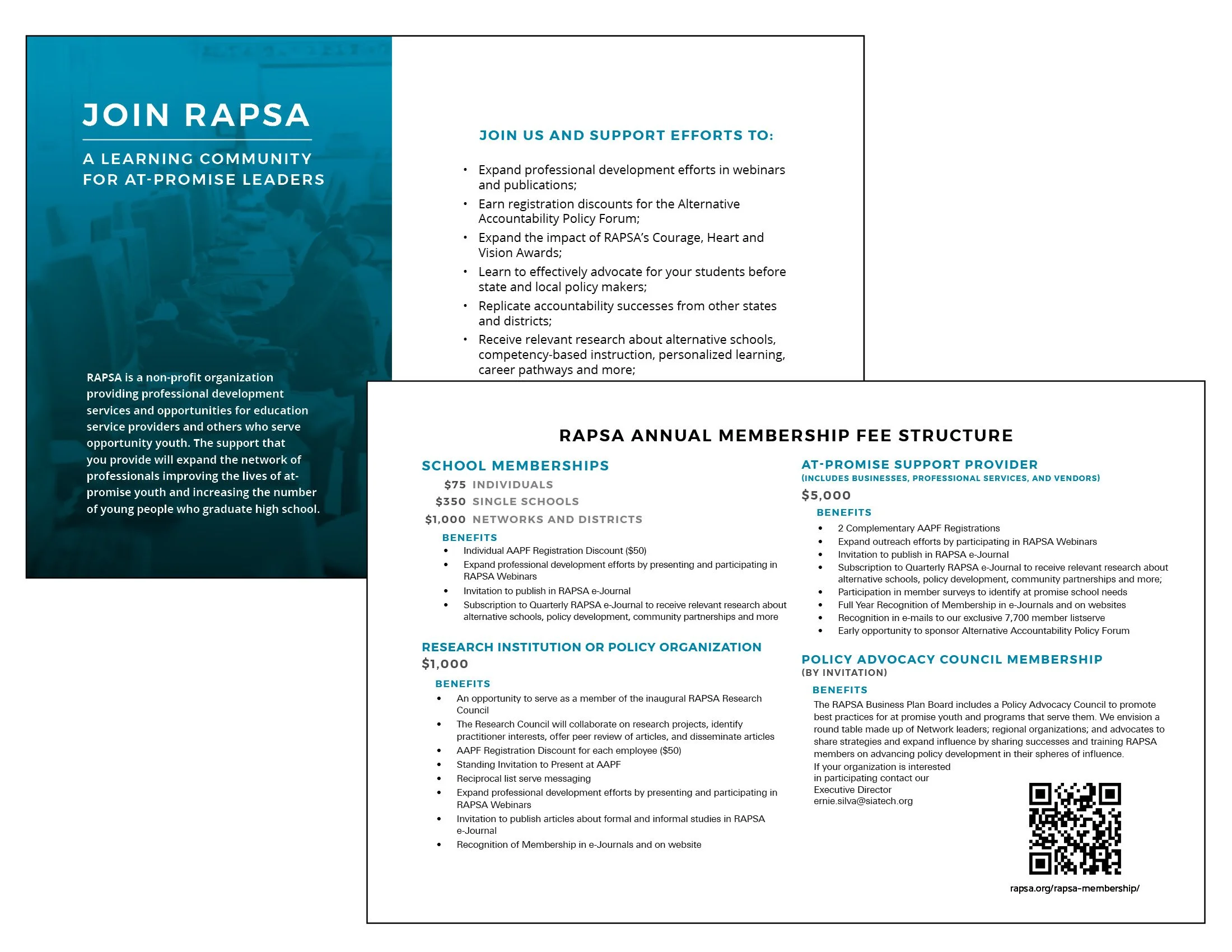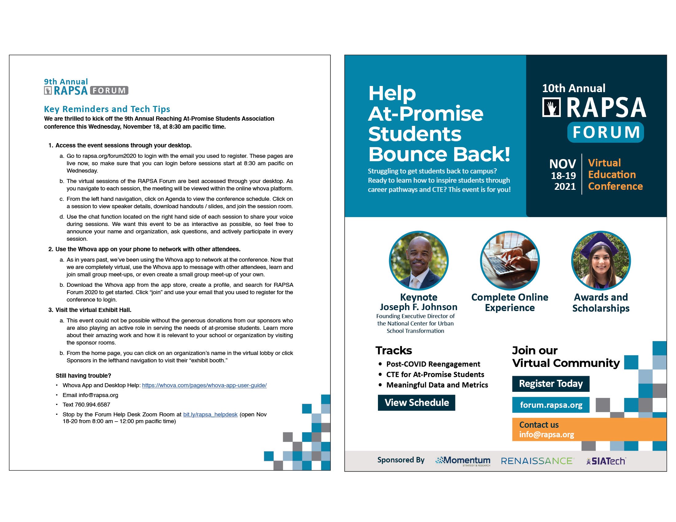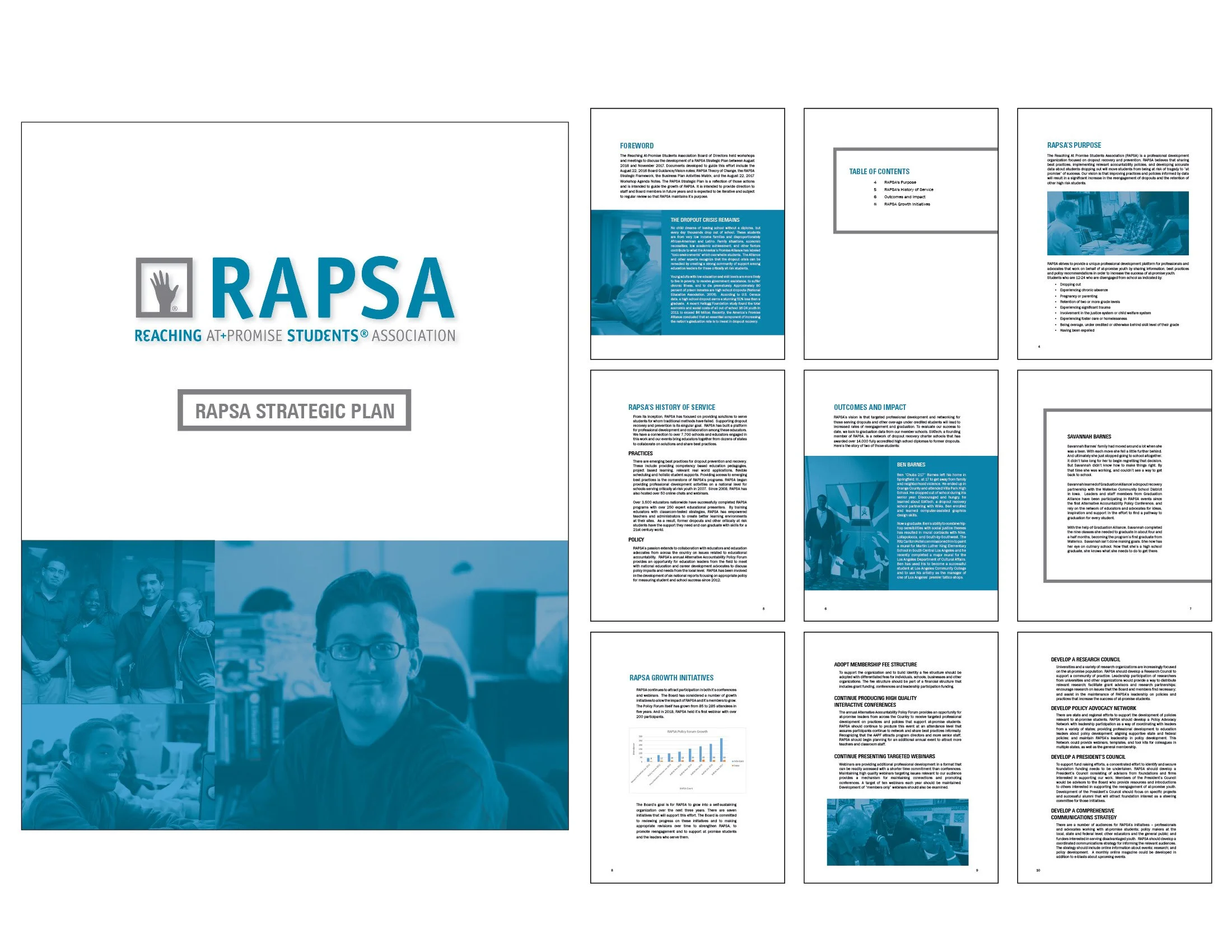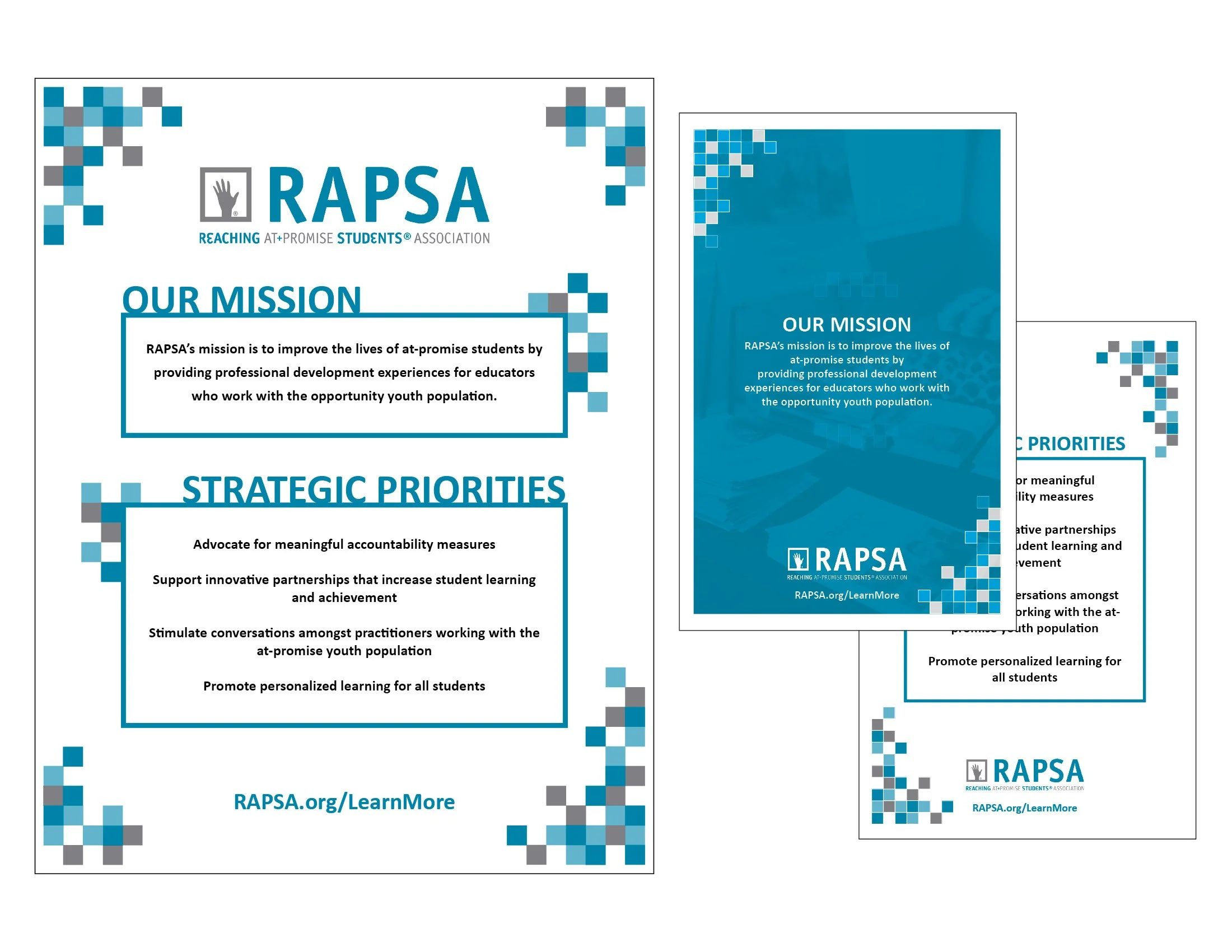 RAPSA (Reaching At-Promise Students Association) is a nonprofit organization focused on helping educators working with at-risk students. Most of the work I created for RAPSA included internal documents, professional reports for sponsors and partners, and marketing materials to be used at the annual conference. The AAPF (Alternative Accountability Policy Forum) was rebranded to the RAPSA Forum in 2020, where it was also our first all-virtual conference.